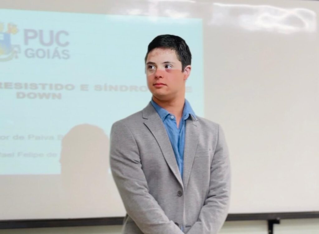 O influenciador e ativista social João Vitor de Paiva apresentou nesta terça- feira (10) na Pontifícia Universidade Católica de Goiás (PUC GOIÁS), o seu primeiro Trabalho de Conclusão de Curso com o tema: Treinamento Resistido na Síndrome de Down. Com isso, ele se torna o primeiro estudante com síndrome de down a apresentar um TCC no curso de Educação Física do Brasil.