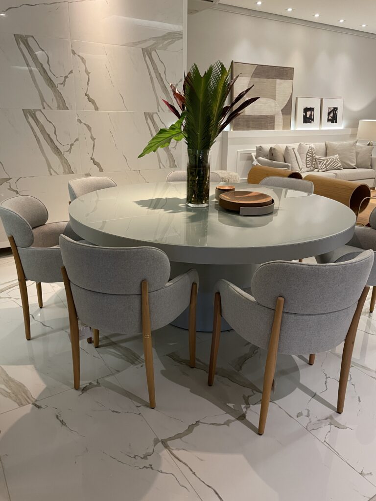 A mesa de jantar da Sierra, com acabamento suave e orgânico, convida ao convívio prolongado. As cadeiras estofadas, desenhadas para acolher sem pesar visualmente, completam a composição do ambiente com delicadeza e sofisticação.